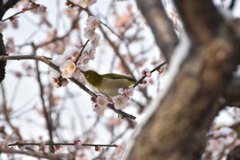 昨日に続き雪の大川☃️我家の枝垂れ梅が咲いています、その蜜を吸いにメジロがやって来ました、春はそこまてで来たのかな。 撮影者 息子